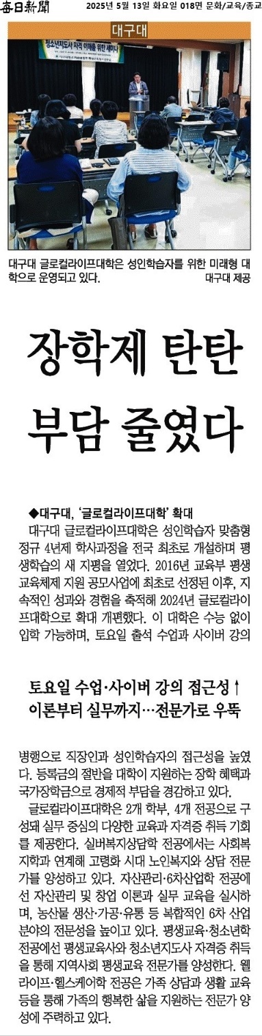 2025.05.13. (화) 매일신문 "장학제 탄탄 부담 줄였다. 대구대 ‘글로컬라이프대학‘ 확대"