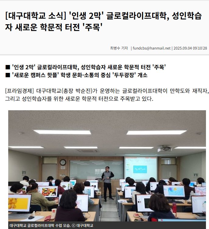 2025.09.04. (목) 프라임경제 " ‘인생 2막‘ 글로컬라이프대학, 성인학습자 새로운 학문적 터전 ‘주목‘ "